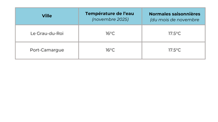 Température de l’eau pour le Gard : aux alentours de 16 degrés en moyenne pour le mois de novembre 2025, contre une moyenne des normales saisonnières de 17.5°C.