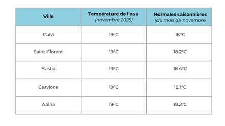 Température de l’eau pour la Haute-Corse : aux alentours de 19 degrés en moyenne pour le mois de novembre 2025, contre une moyenne de normales saisonnières de 18.1°C.