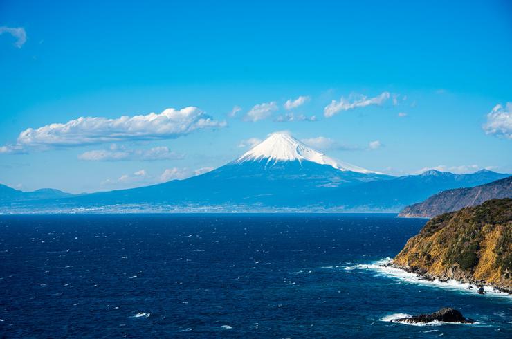 Baie de Suruga : navigation japonaise entre falaises, mer profonde et silhouette du mont Fuji