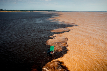 Les eaux sombres et acides du Rio Negro, teintées de brun profond par la décomposition des feuilles et des racines, contrastent violemment avec les eaux boueuses du Rio Solimões, chargées de sédiments arrachés aux Andes. Leur union, pourtant inévitable, est retardée par la physique :