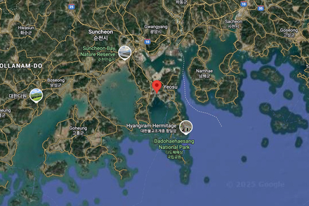 La baie de Yeosu s’inscrit dans un ensemble côtier complexe, entre la presqu’île de Yeosu à l’est et les premières îles du parc maritime national de Dadohaehaesang à l’ouest. Elle est naturellement protégée du large par plusieurs couches d’îlots, qui atténuent la houle et rendent la navigation intérieure particulièrement calme.