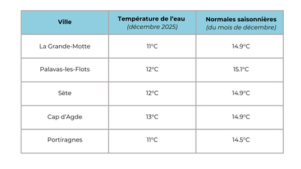 Température de l’eau pour l’Hérault : aux alentours de 11.8°C en décembre 2025, contre une moyenne de normales saisonnières de 14.9°C.