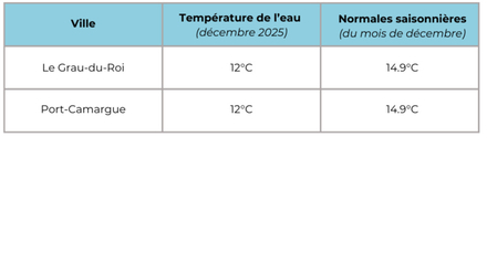 Température de l’eau pour le Gard : aux alentours de 12°C en décembre 2025, contre une moyenne des normales saisonnières de 14.9°C.