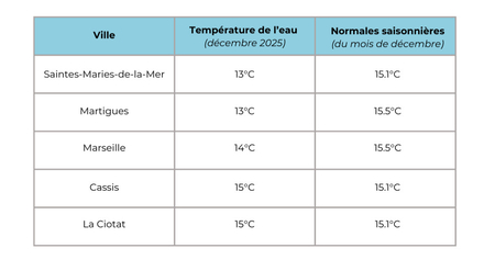 Température de l’eau pour les Bouches-du-Rhône : aux alentours de 14°C en décembre 2025, contre une moyenne de normales saisonnières de 15.3°C.