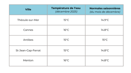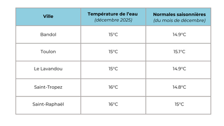 Température de l’eau pour le Var : aux alentours de 15.4°C en décembre 2025, contre une moyenne de normales saisonnières de 15.4°C.