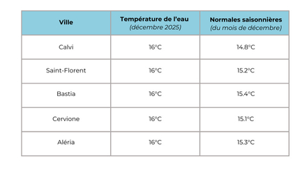 Température de l’eau pour la Haute-Corse : aux alentours de 16°C en décembre 2025, contre une moyenne de normales saisonnières de 15.2°C.