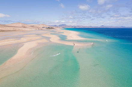 La playa de Sotavento incarne parfaitement cette réputation. Ce vaste espace de sable, structuré par des bancs naturels et une lagune peu profonde, offre des conditions idéales pour le kitesurf et le wingsurf. Le vent y est régulier, l’eau peu profonde sur de longues distances, ce qui permet une pratique en toute sécurité. Le spectacle est permanent. Les ailes colorées dessinent des trajectoires au-dessus de l’eau turquoise, dans un décor quasi désertique.