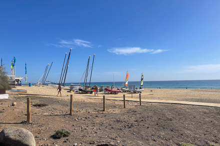 Le surf occupe également une place importante sur la côte est. À Playa del Matorral, l’espace semble infini. Cette immense plage s’étire sur plusieurs kilomètres et accueille aussi bien des surfeurs locaux que des vacanciers venus profiter de l’Atlantique. L’ambiance y est détendue, sans pression, chacun trouvant naturellement sa place sur le sable ou à l’eau.