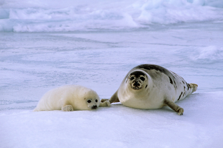 Les phoques occupent eux aussi une place centrale dans cet écosystème. Phoques annelés, phoques barbus ou phoques du Groenland utilisent la banquise, les icebergs et les rivages comme zones de repos et de reproduction. Leur présence constante rappelle le lien étroit entre la glace et la vie marine, même dans des conditions qui paraissent extrêmes. Autour des colonies, les oiseaux marins sont omniprésents, nichant sur les falaises côtières et se nourrissant dans les eaux riches des fjords.