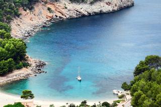 Située sur la spectaculaire péninsule de Formentor, à l’extrême nord de l’île, Cala en Gossalba est l’une des criques les plus isolées du secteur. Encerclée par des falaises calcaires abruptes, elle ne dispose d’aucune route directe ; l’accès par la mer s’impose naturellement, renforçant son caractère confidentiel. L’arrivée en bateau est impressionnante : les parois blanches plongent dans une eau d’un bleu profond qui s’éclaircit progressivement à l’approche de la plage de galets. Les fonds alternent sable et roches, avec une profondeur qui augmente assez rapidement en quittant le rivage. Le mouillage peut s’envisager par 6 à 10 m sur fond sableux, en veillant à bien positionner l’ancre entre les zones rocheuses. La tenue est correcte par temps stable, mais l’exposition aux vents de nord et à la houle associée impose de surveiller attentivement les prévisions. Au printemps, la crique conserve une atmosphère presque intacte. Le trafic maritime reste modéré et le silence n’est troublé que par le ressac et le vent dans les pins accrochés aux falaises. C’est un mouillage à privilégier pour quelques heures ou une nuit bien choisie, lorsque les conditions sont favorables.