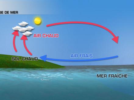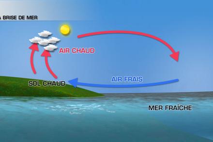 En période estivale, lorsque le temps est calme et que les conditions anticycloniques dominent, les brises de mer se mettent à souffler sur nos côtes. Elles apportent un temps bien ensoleillé sur nos plages alors que les nuages se développent dans l’intérieur des terres.