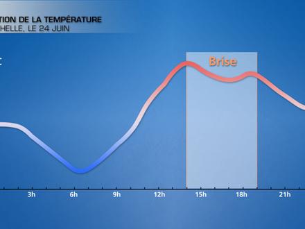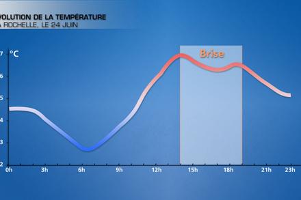La brise a pour effet, en lien avec l’arrivée d’air plus frais venu de la mer, de stabiliser la masse d’air. Le ciel est donc dégagé sur la frange littorale et les vacanciers profitent d’une très belle journée ensoleillée alors que dans l’intérieur des terres avec l’air plus chaud et instable, des nuages vont rapidement se développer en journée. Si le soleil domine lors d’un journée avec brise, les températures restent modérées en raison de l’arrivée d’air frais venu de la mer. Ainsi, si les températures grimpent rapidement en matinée, on observe souvent une baisse des températures avec l’arrivée de la brise à la mi-journée. Dans l’après-midi, la persistance de la brise va limiter la hausse des températures. Par temps de brises, on observe donc souvent d’importantes différences de températures entre le littoral et l’arrière-pays.