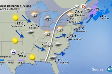 Les Etats-Unis font face, depuis lundi, à des températures glaciales dues à la descente d'air froid en provenance du pôle nord. Les services de météorologie américains ont relevé dans la journée de lundi des températures de 10 à 20°C inférieures à la normale saisonnière dans le Montana, les deux Dakota, le Minnesota, l'Iowa, le Wisconsin, le Michigan et le Nebraska.