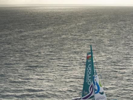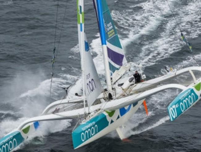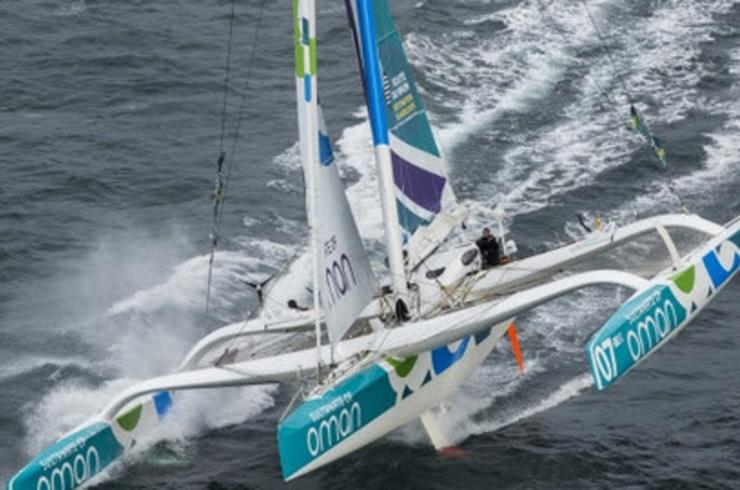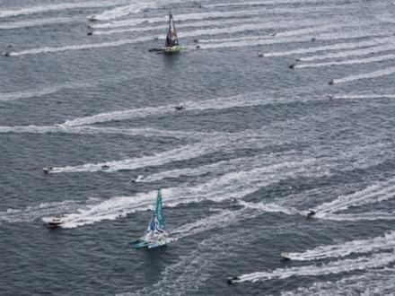 EN IMAGES - Le Multi70 Musandam - Oman Sail, de couleur turquoise, a coupé la ligne en tête de la flotte, tout en faisant le spectacle pour le public venu admirer le départ sur l’eau depuis les nombreux bateaux spectateurs qui ont bravé la météo ce dimanche.