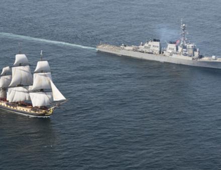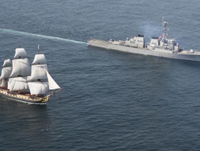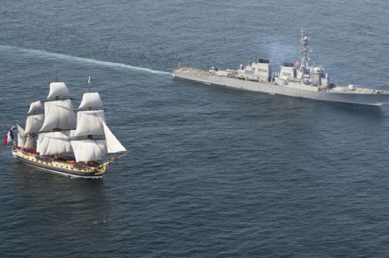 Le 2 juin en fin de journée, le destroyer USS Mitscher a accueilli l'Hermione, la réplique de la Frégate du Marquis de La Fayette sur les côtes de Norfolk (USA) en Virginie . Un hommage aux marins disparus lors de la bataille décisive de Yorktown en 1781 a été rendu en mer à cette occasion.