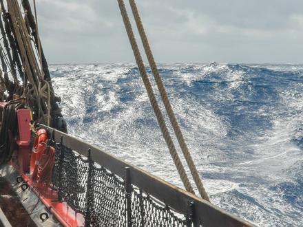 Difficile de décrire une journée comme celle que nous venons de passer. Difficile également de la rendre à l'image. Quoi qu'on fasse, les objectifs affaissent les montagnes d'eau qui ont défilé sous notre quille et les mots n'ont pas la force d'une rafale de vent à 45 nœuds. Les regards ont été nombreux à se perdre dans cette majestueuse houle atteignant 7 mètres établis au plus fort.