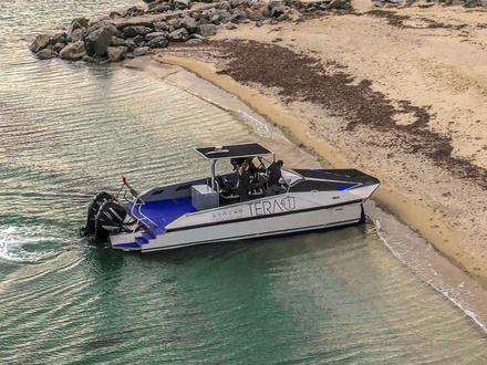 Son faible tirant d'eau - 30 cm en waterjet et 50 cm en hors-bord - permet de naviguer sur des eaux peu profondes sans détériorer les fonds marins et de se rapprocher jusqu'au bord du rivage.