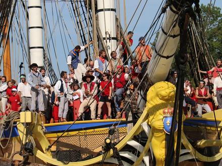 Après cet espace découverte, la montée à bord de la frégate permet d’accéder aux deux ponts principaux, là-même où se déroulent – en navigation - les manœuvres, où sont positionnés les canons et où l’équipage prend ses repas. Le temps d’une visite, prendre la barre de L’Hermione sera idéal pour s'évader. A bord, un matelot est présent en permanence pour répondre aux questions du public.