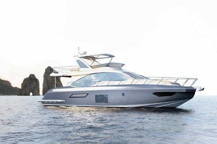 L'Azimut 55 Fly possède des lignes fluides et un intérieur très cosy et design, avec un mélange de matériaux différents : chêne foncé, laque noire brillante ou encore inserts en bronze et en acier. Ce qui frappe en premier sont les contours du flybridge qui s'étend encore plus loin que la poupe, pour créer un deuxième espace lounge extérieur composés de deux canapés, à l'abri des regards indiscrets !