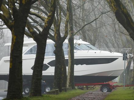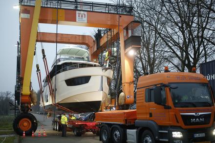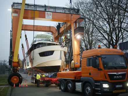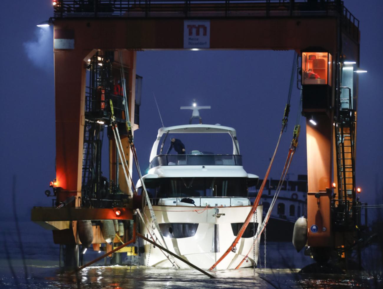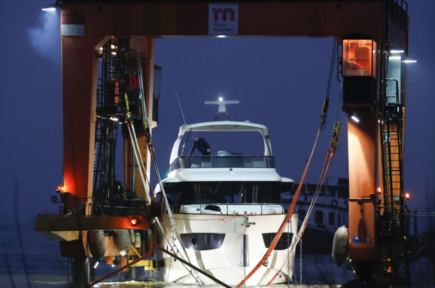 La grue "Big Willi" est prête à soulever les plus gros yachts du Rhin pour ensuite les déposer sur le lieu du salon. Le 20 décembre à 8h, elle a déjà lever le Navetta 58 d'Absolute de 32 tonnes, pour qu'il soit ensuite transporté jusqu'au hall 6. Long de 17 mètres, il sera exposé avec d'autres voiliers de luxe et vendu à un prix de départ de 1,15 millions d'euros.