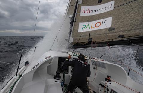 « Je suis monté dans le mât ce matin, c'était la guerre, par 30 nœuds et une mer toujours costaud. J'avais ballasté le bateau pour le stabiliser un peu. J'ai mis une heure pour monter... et il m'a fallu ensuite 40' pour couper mon Solent et autant pour libérer l'étai. A chaque vague, il fallait faire attention de ne pas se prendre un coup de couteau dans le nez ! Le souci c'est qu'avec les tensions et les frottements au niveau de l'attache de l'étai de trinquette : il est tombé lui aussi ! Le mât ne tient plus que par des drisses. Il faut donc passer par la case « Portugal » pour réparer. Mais l'objectif reste de repartir au plus vite avec un bateau à nouveau en état de performer. »