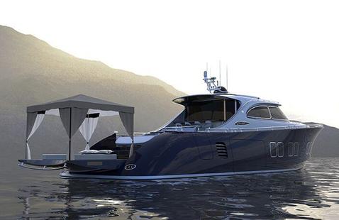 La plateforme arrière est équipée d'une piscine transversale de 6 mètres, et d'une "salle" de cinéma en plein air.