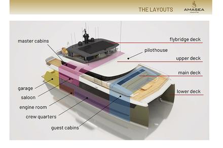 Suite à sa présentation en mars dernier à Monaco, Amasea Yachts vient de publier des informations supplémentaires concernant son premier catamaran à moteur, l'Amasea 84. Ce catamaran à trois pont sera équipé en standard d'un grand salon / salle à manger sur le pont principal de 63 m2, et deux cabines avant de 16,7 m2 chacune. Deux cabines VIP sont situés à l'arrière et la suite principale sur le pont supérieur. La partie réservée à l'équipage est située au pont inférieur, ainsi que les deux compartiments moteur, la buanderie et le garage. On retrouve à l'extérieur une terrasse immense avec poste de pilotage, et espace de détente. Prix estimé de l'Amasea 84 : 6,5 millions d'euros...