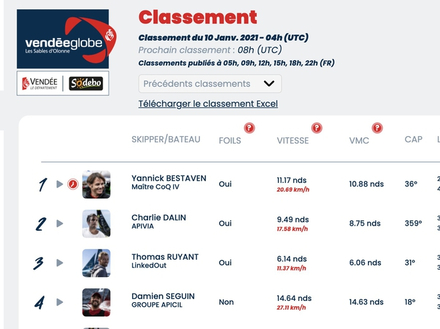 Vendée Globe Classement de 5h , Yannick Bestaven toujours en tête