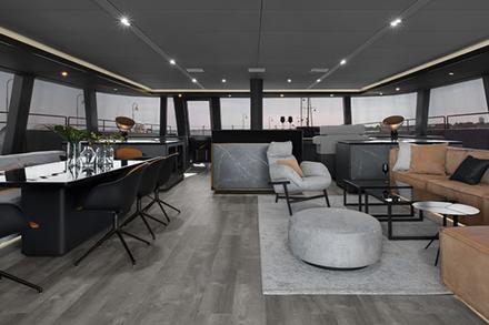Les intérieurs magnifiquement aménagés offrent un hébergement luxueux pouvant accueillir jusqu’à 8 personnes dans 4 cabines avec salle de bain, dans un décor élégant mêlant des tons gris, noirs et cognac. L’opulente suite principale est équipée d’un canapé, d’un lit double et d’un dressing, ainsi que d’une salle de bain avec un bain de vapeur.