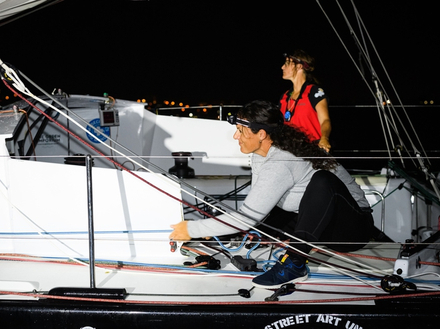 La Transat Jacques Vabre 2021 était une édition spéciale car malgré un nouveau trajet sans traversée du difficile pot au noir, les concurrents ont rencontré des conditions toutes particulières. Tout d’abord, des vents exceptionnellement faibles pour la saison, avec un début de course qui connaît trois épisodes de calme plat. Les 1ers ont bénéficié d’un système météo dont les autres n’ont pas pu profiter et les écarts se sont alors creusés. La course s’annonçait alors bien plus longue que prévu, ce qui a contraint UP Sailing à drastiquement réduire la consommation d’énergie du bord. Morgane et Julia se sont relayées à la barre jusqu’à 22h par jour. Plus tard, des forts grains auront eu raison des deux spinnakers qui se sont déchirés, des voiles pourtant indispensables pour cette route qui se navigue aux deux tiers au portant. Une réparation de fortune du grand spi aura demandé pas moins de 20h de couture mais elle n’aura tenu que quinze minutes. L’équipage a donc dû continuer la course avec des voiles moins adaptées tout en essayant de conserver une place honorable dans le classement.