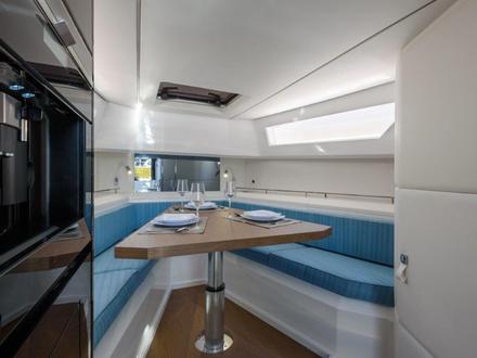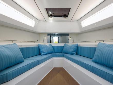 Sous le pont, les intérieurs accueillent les invités avec des espaces confortables et spacieux, également caractérisés par la transformabilité typique des modèles Evo Yachts, avec la zone avant qui, en quelques secondes, passe d'une grande dinette à un confortable espace de couchage, ajoutant un lit double supplémentaire à celui de la cabine séparée. Les intérieurs peuvent être personnalisés en termes de disposition, de design et d'accessoires à la demande du propriétaire.