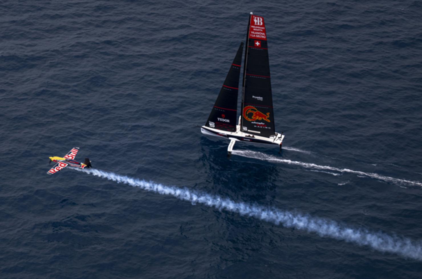 Les bateaux de l’America’s Cup ont déjà l’habitude de voler au dessus de l’eau, mais cette semaine, Alinghi Red Bull Racing et Luna Rossa Prada Pirelli ont donné un véritable show aérien au large de Vilanova i la Geltrú en Catalogne. Les deux AC40 se sont lancés dans une démonstration de vol avec un avion Edge 540 piloté par l’Italien Dario Costa.