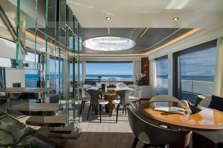L'extérieur de l'Ax8 s'ouvre sur la mer, offrant des espaces aménagés, deux solariums spacieux, sans marches entre eux, l'un sur le pont principal et l'autre sur le flybridge pour socialiser, profiter de l'air libre et contempler la mer depuis différentes hauteurs. Ce modèle privilégie l'habitabilité dans tous ses espaces, avec des intérieurs aux fenêtres XXL, particulièrement lumineuses. Sur le pont inférieur, les cabines VIP sont réparties à l'arrière et sur toute la largeur, et la cabine d'invités à l'avant, également aux dimensions généreuses. La zone de repos est complétée par deux autres cabines spacieuses. Toutes disposent d'une salle de bain attenante, de vastes placards et de nombreux espaces de rangement.