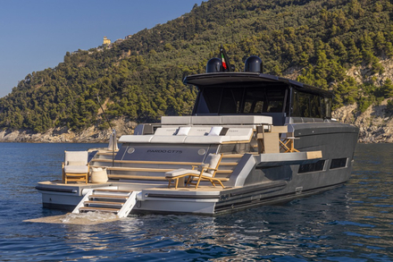 Le nouveau navire amiral, mesurant près de 23 mètres de long, adopte le style caractéristique de Pardo Yachts, avec des éléments comme l'étrave inversée, le pare-brise incliné et une connexion avec la mer. Avec son design élégant et épuré, le Pardo GT75 s'intègre harmonieusement dans son environnement. Comme le décrit Gigi Servidati, président de Cantiere del Pardo : "C’est une villa sur la mer, conçue pour offrir une expérience unique." Il ajoute : "Le Pardo GT75 incarne la vision que nous avons réalisée, grâce à notre savoir-faire en construction navale, combiné à un design et des technologies avancées."