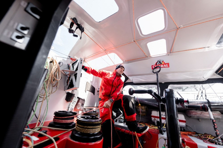 Un bateau très sollicité mais qui répond présent. « Avec un vent pareil, tout est très vite compliqué. Quand il monte très fort, j’ai toujours un peu d’appréhension à abîmer les voiles dans les manoeuvres. J’ai l’impression d’avoir toujours une épée de Damoclès au-dessus de moi. J’ai cassé la galette de J3 au début et ça m’angoisse d’avoir des problèmes du même type... J’ai eu quelques petits soucis d’électronique, j’ai tenté de réparer mes girouettes aussi... Forcément, avec des conditions comme ça, tu ne peux jamais être serein ».