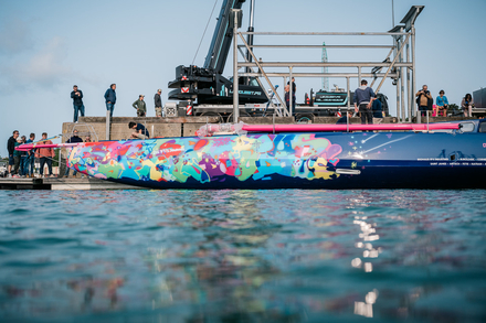 Deux années de travail et plus encore de réflexion, de doutes et de convictions pour confirmer que le projet de construire un bateau de course en carbone ré-employé et en titane récupéré dans les blocs opératoires pouvait devenir une réalité. Ce mardi matin, Armel Tripon, Nolwenn Febvre, l’équipe des P’tits Doudous, les soignants et tous ceux, qui a un moment ou un autre, ont oeuvré à donner vie à ce défi architectural et humain, étaient réunis à La Trinité sur Mer, port d’attache de cet IMOCA flambant neuf, pour sa mise à l’eau. Bijou technologique, ce voilier est aussi une véritable oeuvre d’art, arborant l’inspiration, le talent et les couleurs qui caractérisent le travail du grapheur Cyril Kongo, venu il y a quelques semaines peindre à même la coque ce tableau exceptionnel. Dans quelques jours, Les P’tits Doudous tireront leur premier bord, Armel Tripon, skipper comblé, à la barre. Pour l’accompagner dans la phase de mise au point de sa monture, il pourra compter sur le coach le plus réputé de la course au large, Tanguy Leglatin, qui sera également son co-skipper sur la prochaine Transat Café L’Or.