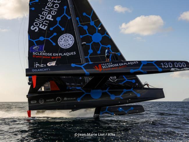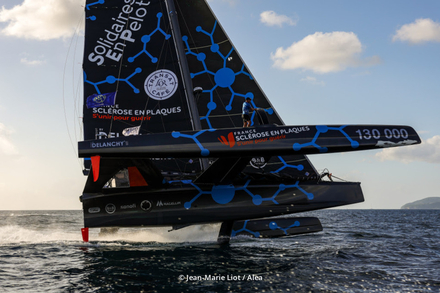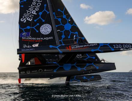 « Nous sommes arrivés hier soir après une semaine de convoyage » déclare Thibaut. « Tout s’est bien déroulé. Ce jour, nous allons mettre notre trimaran en mode de course et nous avons quelques bricoles à faire à bord afin d’être prêt pour demain et la journée d’entraînement. Dès mercredi, la compétition débutera avec des parcours construits entre bouées au programme. Du beau temps est annoncé et des conditions de vent optimales jeudi et vendredi entre 15 et 20 nœuds. J’embarque Fred Le Peutrec à la tactique et aux réglages. Fred a une grande expérience du multicoque de course. Il a participé aux Jeux Olympiques d’Atlanta et a beaucoup navigué sur les trimarans ORMA de l’époque. Axelle Pillain sera également à bord et opérera sur la plage avant. Axelle est discrète et très efficace. Elle navigue à mes côtés depuis trois saisons. Gwen Riou sera à l’embraque et régleur. Il a une véritable maîtrise du multicoque et connait Solidaires En Peloton pour avoir participé avec nous à deux actes en 2025. Enfin, j’embarque Fabien Delporte, copain d’enfance, il était mon voisin en Guadeloupe. Il est champion de Guadeloupe en titre de voile traditionnelle. Il rêvait de participer à une compétition avec nous. Je vais pouvoir compter sur son physique et son expérience à bord de Solidaires En Peloton puisqu’il était de toutes nos sorties guadeloupéennes. »