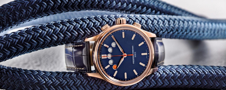La montre Yacht Timer Regatta Countdown a été aussi pensée pour favoriser la lisibilité. Captant chaque reflet de lumière, le cadran guilloché présente des index facettés pour toujours offrir une face polie brillante, visible quelle que soit l’incidence du soleil. Si celui-ci est voilé, aiguilles et index sont emplis de matière luminescente. Quatre modèles sont proposés dans un boîtier de 42 mm de diamètre, étanche jusqu’à 100 mètres. Deux sont en acier plaqué or rose, dotés d’un cadran argenté ou bleu marine et montés sur bracelet alligator. Bicolore, la troisième version marie l’acier et l’or rose, sur un bracelet lui aussi à deux tons. Sobre, la quatrième variation privilégie l’acier, mis en valeur par un cadran argenté, le tout habillé d’un bracelet alligator noir.