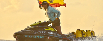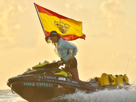 Et comme Alvaro aime (re)nouer des liens avec l’histoire maritime, et honorer ces héros du XVème et XVIème siècle, il s’est engagé depuis 30 ans, seul au guidon de son scooter de mer, baptisé « Numancia » (nom espagnol du village ayant résisté à l’invasion romaine...!), dans des expéditions à mi-chemin entre l’exploit sportif et l’aventure, dans des passages ou des traversées océaniques sur une embarcation plus proche de l’engin de plage que d’un bateau…