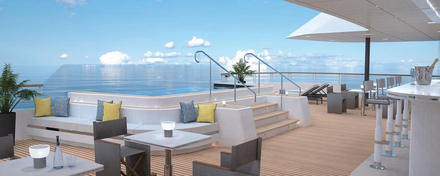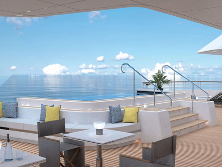 Avec un membre d’équipage par passager et ce critère d’espace disponible par passager exceptionnel, ces futurs navires créent une nouvelle catégorie, intermédiaire entre superyachts et paquebots, même les plus luxueux de ces derniers. Car il convient bien ici de parler de suites et non de cabines, puisque chacune d’elles ne fera pas moins de 100 m². Elles seront toutes prolongées d’une terrasse de 59 m² avec vue directe sur la mer. Ces dernières intègrent même un jacuzzi privatif, mais l’intérieur n’est pas en reste. Dans un design au luxe contemporain, il accueille salon, salle à manger, chambre avec lit king-size et deux salles d’eau. Bien sûr, un concierge personnel est disponible 24 heures sur 24, tout comme les repas à prendre dans sa suite ou dans l’un des six restaurants disponibles. Tout est prévu à bord, jusqu’au dress-code. Même s’il se veut décontracté, impossible de se promener pieds-nus dans les coursives, ni de porter un t-shirt pour le dîner, tout doit être en harmonie avec le style de vie luxueux qui sied si bien à la marque Ritz-Carlton. Il faudra y songer avant de se rendre à la cave à vin, au spa, ou à la marina formée par l’immense plateforme arrière. Depuis cette véritable plage privée, de nombreux sports nautiques seront proposés. Il n’est cependant pas prévu de sports motorisés, afin d’être en parfaite adéquation avec les objectifs environnementaux prônés. Ainsi, la motorisation devrait fonctionner au Gaz Naturel Liquéfié. Un carburant pas encore vert, mais qui permettra d’aller bien au-delà des normes exigées à l’horizon 2025.