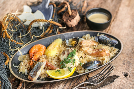 7. Dressez la choucroute sur un grand plat de service : disposez la choucroute au fond, puis placez délicatement les morceaux de poissons et les crevettes sur le dessus. Servez avec des quartiers de citron et une noix de beurre fondu.
