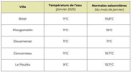 Température de l'eau pour le Finistère : aux alentours de 10.6 degrés en moyenne pour ce mois de janvier, contre 10.6°C pour la moyenne des normales saisonnières.