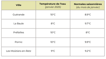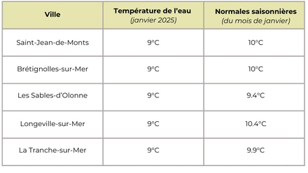 Température de l'eau pour la Vendée : aux alentours de 9 degrés en moyenne pour ce mois de janvier 2025, contre une moyenne de normales saisonnières de 9.9°C.
