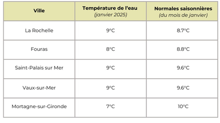 Température de l'eau pour la Charente-Maritime : aux alentours de 8.4 degrés en moyenne pour ce mois de janvier 2025, contre une moyenne de normales saisonnières de 9.3°C.
