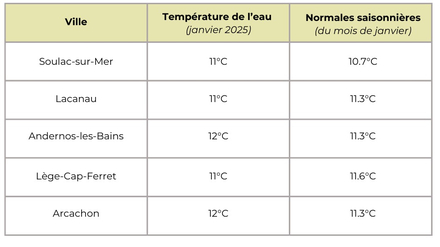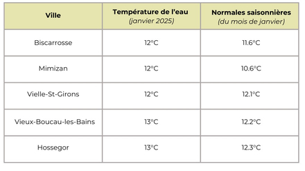 Température de l'eau pour les Landes : aux alentours de 12.4 degrés en moyenne pour le mois de janvier 2025, contre une moyenne de normales saisonnières de 11.7°C.
