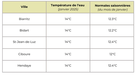 Température de l'eau pour les Pyrénées Atlantiques : aux alentours de 14 degrés en moyenne pour ce mois de janvier 2025, contre une moyenne de normales saisonnières de 12.2°C.