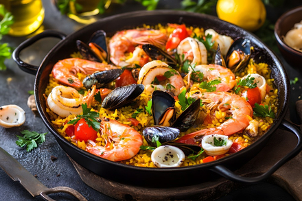 Originaire de Valence, en Espagne, la paella est d’abord un plat populaire des campagnes, composé de riz, de légumes et de viande (poulet et lapin). Mais dans les villages côtiers, où les pêcheurs revenaient avec des paniers remplis de trésors marins, une nouvelle déclinaison a vu le jour : la paella aux fruits de mer. Ce mariage entre terre et mer repose sur une base incontournable : un riz safrané, doré à souhait, qui absorbe un bouillon riche et parfumé. À cela s’ajoutent des crevettes, moules, calamars, palourdes et parfois des langoustines ou pétoncles, sublimés par de l’ail, des tomates et une pointe de paprika fumé.