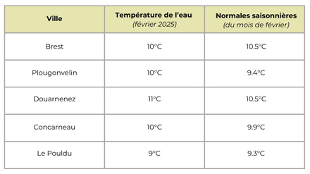 Température de l'eau pour le Finistère : aux alentours de 10 degrés en moyenne pour ce mois de février, légèrement au-dessus de la moyenne des normales saisonnières de 9.9°C.