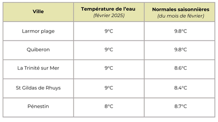 Température de l'eau pour le Morbihan : aux alentours de 8.8 degrés en moyenne pour ce mois de février 2025, contre une moyenne de normales saisonnières de 9.1°C .