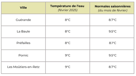 Température de l'eau pour la Loire-Atlantique : aux alentours de 8.4 degrés en moyenne pour ce mois de février 2025, légèrement en dessous de la moyenne des normales saisonnières de 8.9°C .